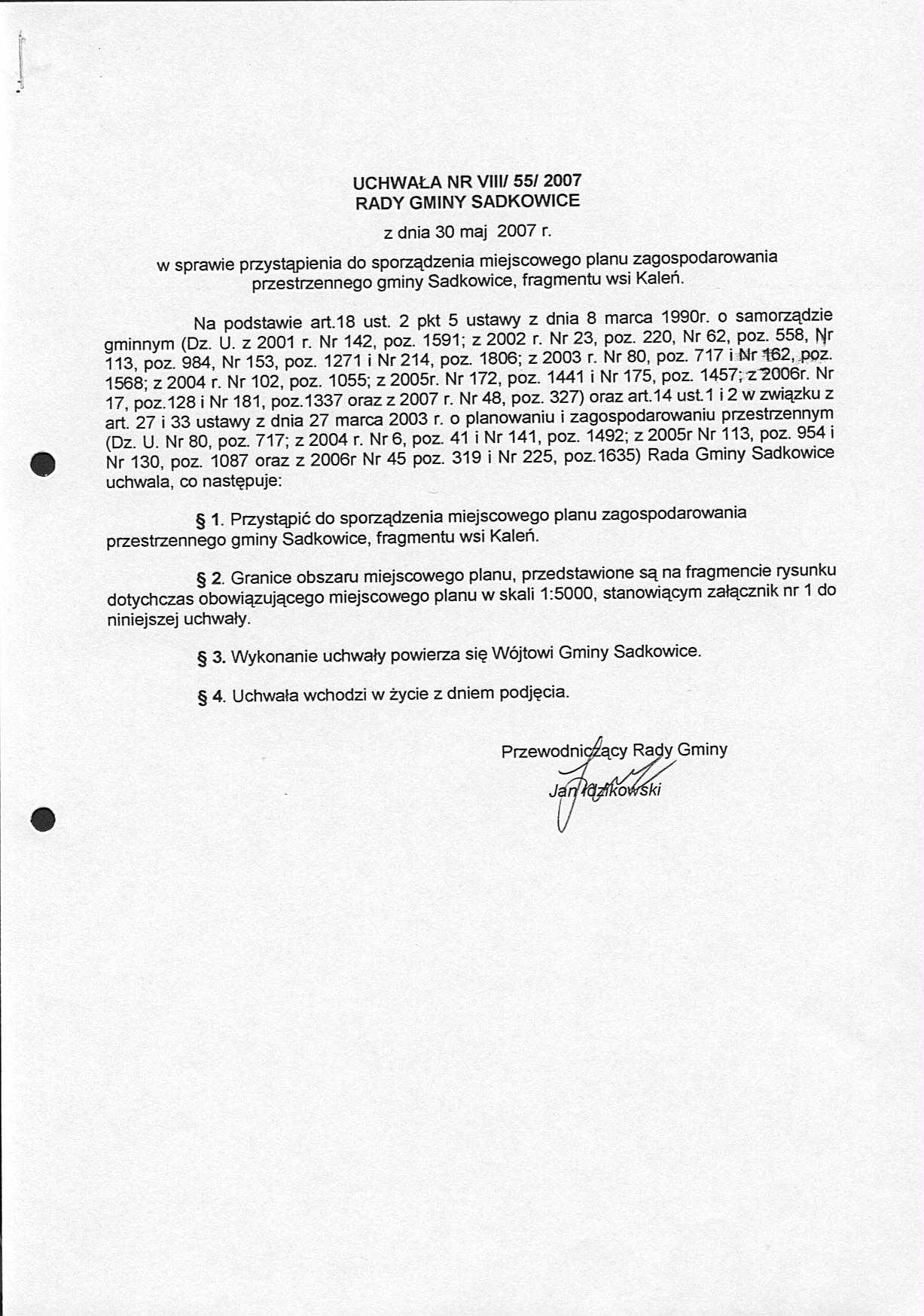w sprawie przystąpienia do sporządzenia miejscowego planu zagospodarowania przestrzennego gminy Sadkowice, fragmentu wsi Kaleń.