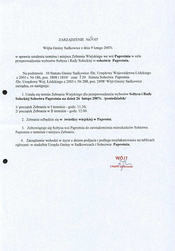 Zarządzenie Nr 1/07 Wójta Gminy Sadkowice z dnia 8 lutego 2007 roku