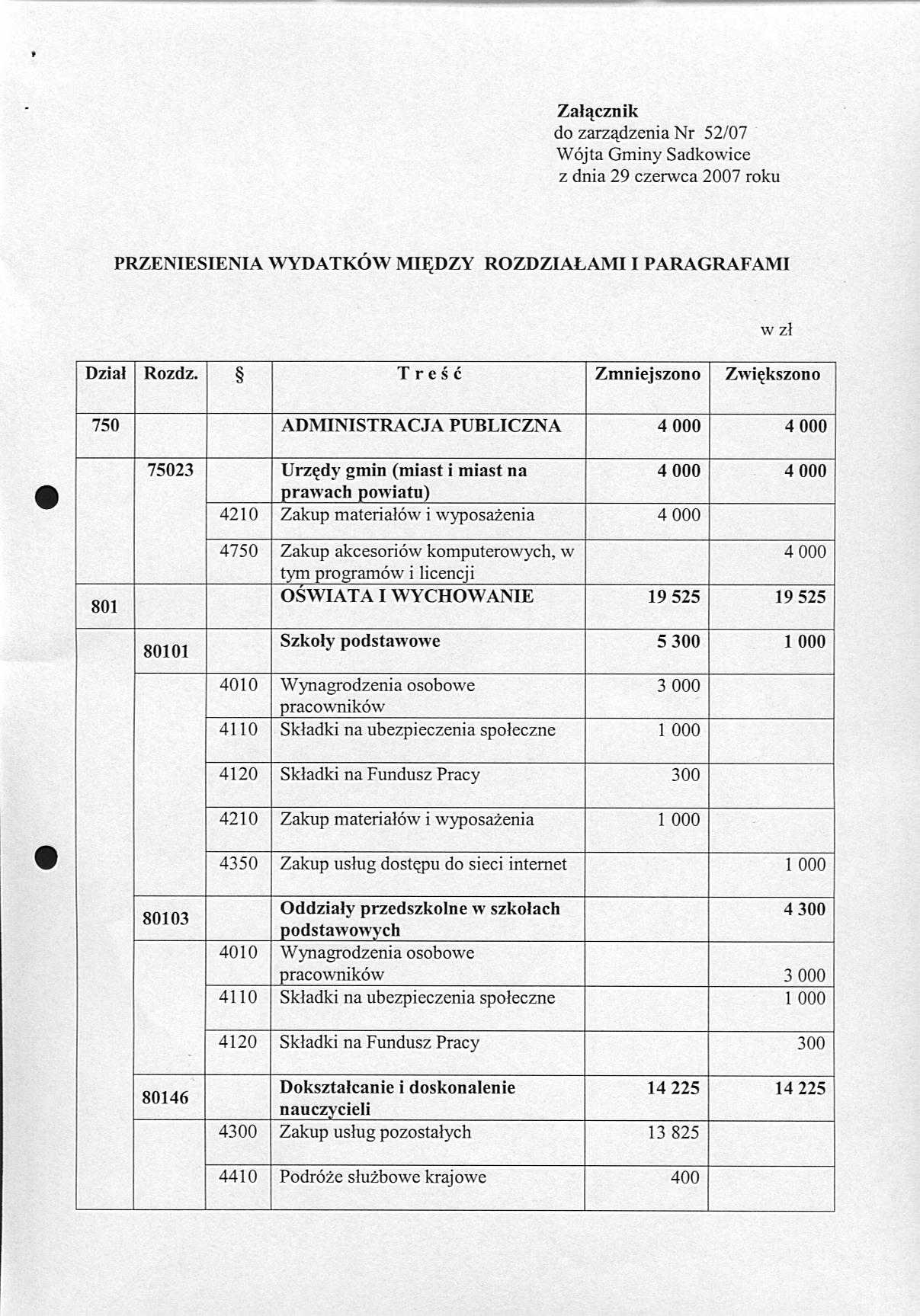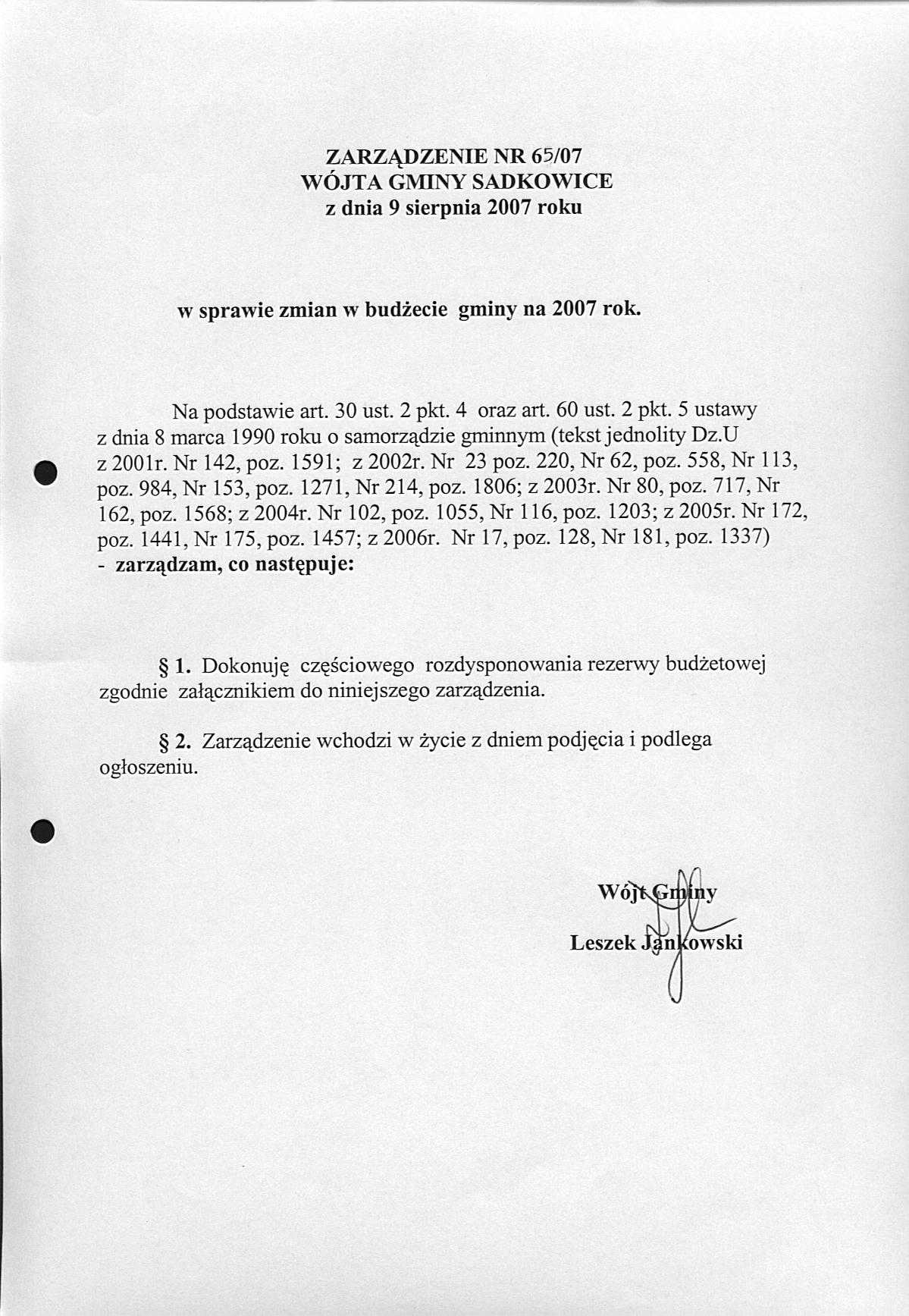 ZARZĄDZENIE NR 94/07 WÓJTA GMINY SADKOWICE z dnia 26 listopada 2007 roku
